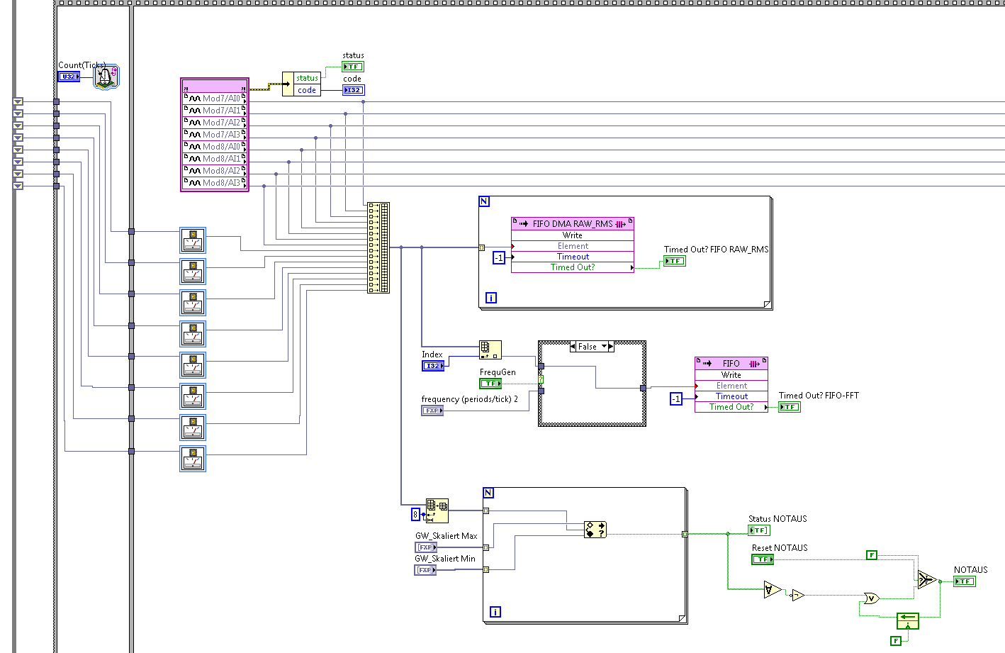 ich versuche derzeit 8 analoge Kanäle mit einem cRIO und zwei 9215 Modulen einzulesen, zu bearbeiten und auf einem Windows Host anzuzeigen und zu loggen.