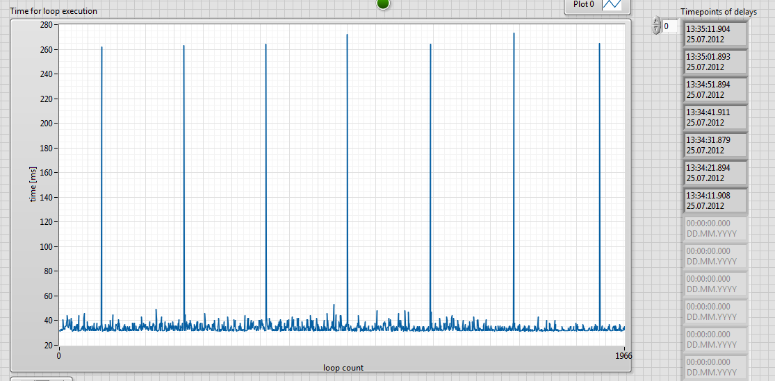 im angehängten test-vi sende ich bei jedem durchlauf des loops ein 1d-array mit nullen an das daq. im schnitt braucht der loop ca 35ms um einmal durchzulaufen. von zeit zu zeit stockt er aber und braucht für einen durchlauf viel länger, nämlich ca 270ms, bevor er dann mit dem nächsten wieder auf 35ms runter kommt.