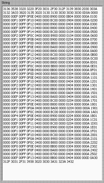 Ich hab mal ein komplettes Beispiel-File als Default Value in das String-Control-Feld eingefügt. Dieselben Daten als HEX-Datensatz findest du als Text-File im Anhang. Ich habe es leider selbst nur als HEX-File bekommen. Bei der Konvertierung in ASCII-Code sind mir leider die End of Line ("0D" HEX =CR) flöten gegangen, keine Ahnung wieso.