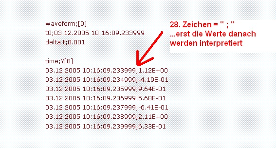 Weil ihn die Zeitinformation aus der Datei erst mal nicht interessiert, wandelt er NUR die Messwerte...diese beginnen in jeder Zeile nach dem 28. Zeichen!