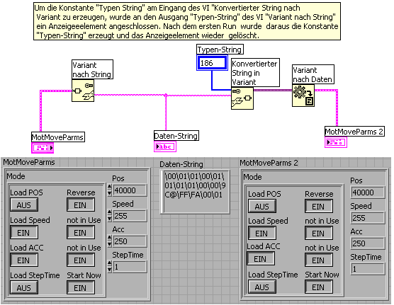 der TypeString ist doch wohl ne Beschreibung, wie deine "flattened Data" zu interpretieren ist. Meiner Einschätzung nach brauchst du das zwingend! So wie ich's verstehe, kannst du diesen TypeString aufspalten und darin enthalten ist die Information "TypeDescriptor" (die letzten beiden Stellen). Such danach mal in der LV-Hilfe! Allerdings gibts das bei LV8.x nicht mehr. Hier könntest du nach "Variant" wandeln und dann den Daten Attribute (z.B. ne "1" ) hinzufügen. Dieses Attribut könntest du in nachfolgenden VI's dann interpretieren, z.B. 1=boolesches Array, 2=double,....und dann mit ner Case-Struktur in den passenden Typ wandeln. So könntest du immer Variant weitergeben, in jedem VI halt dann erst mal den Typ checken...