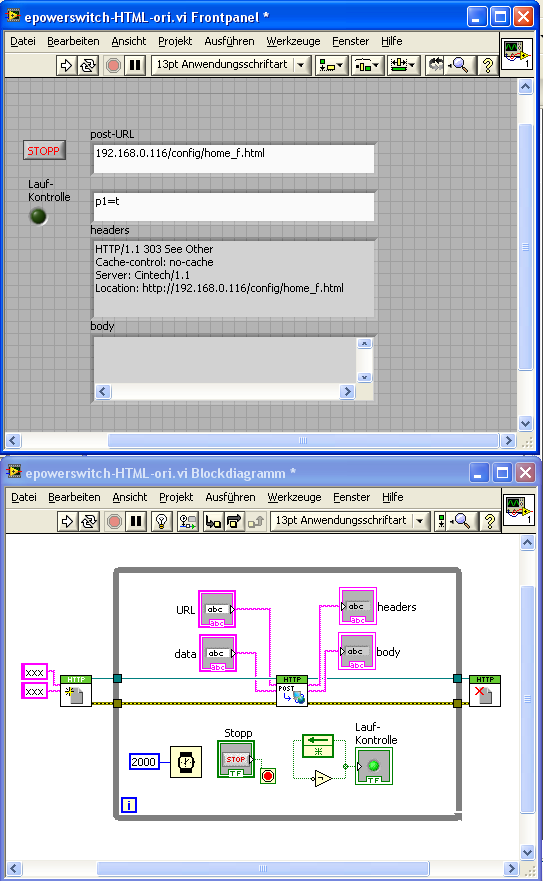 Da gibt es die VIs GET, PUT, POST, ich habe alle probiert, aber auf keinen hat mein Input die erwartete Reaktion verursacht. Aus dem Inhalt des Heaaders von GET habe ich jedenfalls entnommen, daß ich mich ordnungsgemäß eingeloggt hatte. Jetzt muß ich nur die Information rüberbringen, und der Fall ist erledigt.