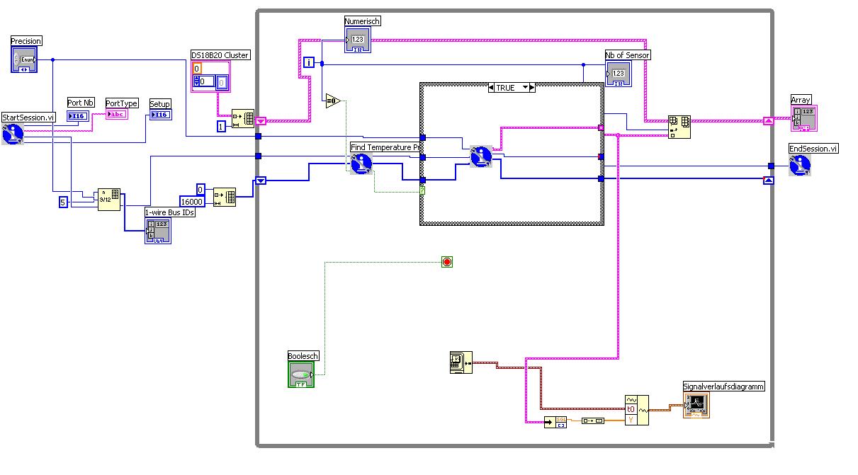 Die Werte werden über eine Treiber DLL in LabVIEW eingelesen und dort zyklisch in einem Array abgelegt. Dabei werden die Sensoren immer einer nach dem anderen abgefragt und jeweils Temperatur und ID des Sensors abgelegt: