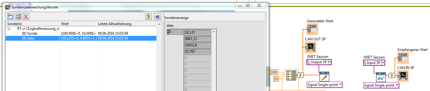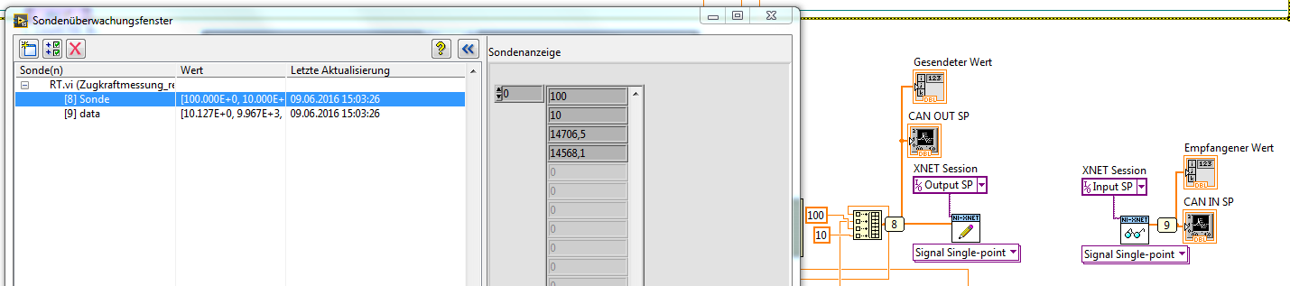 Im Labview Projekt habe ich versuchsweise zwei Konstanten und zwei Signalleitungen zu übertragen versucht. (Der Versuchsaufbau ist folgender: Auf der RT-Ebene meines cRIO Systems werden die Daten über CAN versendet und über ein zweites Modul wieder empfangen):