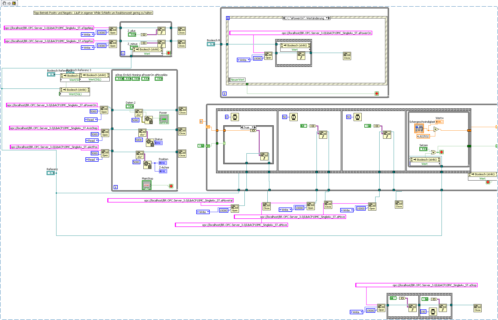 Dein Verfahren mit dem OPC-Management halte ich für sehr schlecht. Ich hab mir eine Klasse (also ein erweitertes FGV) geschrieben, die das OPC-Management macht: Variablen öffnen, kommunizieren, Schließen etc. Was ich für ganz ungünstig halte, ist, dass die OPC-Lese/Schreib-Elemente unsequenziert parallel gemacht werden.