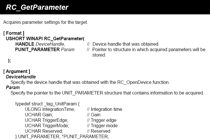 Das Struct kannst du ersetzen durch ein Array of U32 der Länge 2. Das erste Array-Element (Array[0]) ist dann der Wert IntegrationTime (Ob ULONG ein U32 oder ein U64 ist, ist mir gerade entfallen. Musst du halt selbst kucken). Das zweite Array-Element (Array[1]) kannst du mit einer entsprechenden Operation (Zahl teilen), die du in der Palette Numerisch/Datenmanipulation findest, in vier Bytes (UCHAR) aufteilen. Der Pointer PUNIT_PARAMETER wird dann als Typ U32, Zeiger auf Wert, übergeben. Leg an den Eingang des DLL-Knotens ein Array[2] an und an den korrespondierenden Ausgang auch. Im Ausgang müssen dann die Daten stehen, die nur noch "manuell umgetypt" werden müssen.