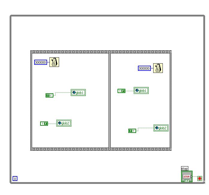 Eher auf der Höhe der Zeit ist die folgende Struktur. Die beiden Schleifen können auch in verschiedenen VIs sein, ohne daß dann globale Variablen benutzt werden müssen.