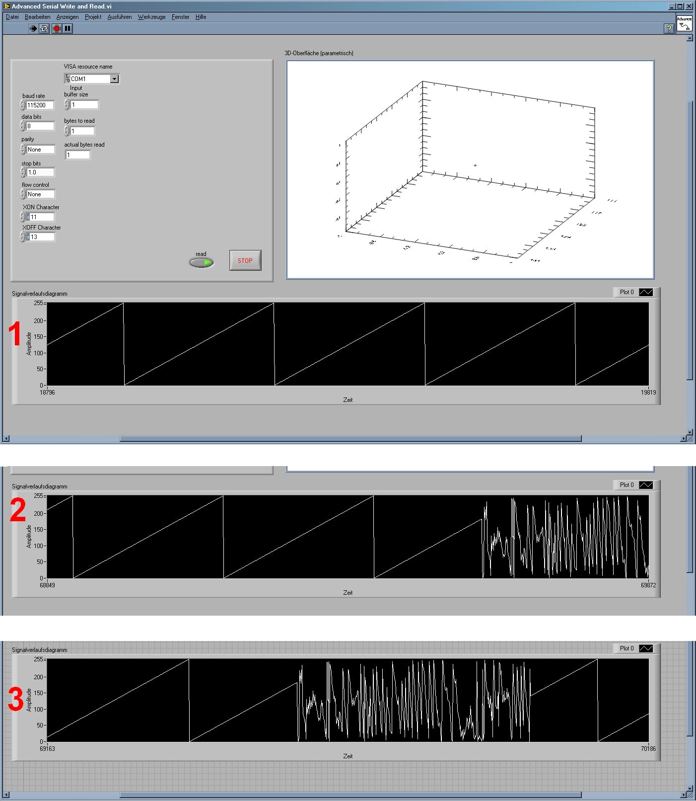 Ich gehe davon aus, dass der VISA-Treiber die Zeichen vom SIO-Controller auch ausließt, wenn der Rechner ausgelastet ist. Eigentlich müsste dann der Puffer zu klein sein respektive die auslesende Applikation zu langsam (weil der Rechner eben ausgelastet ist).