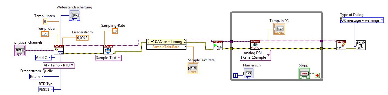 Habe nun die Schleife im sub-VI entfernt und den Inhalt der Schleife im main-VI eingefügt. Nun funktioniert es soweit. Wenn ich jetzt weitere Sensoren hinzufügen möchte, kann ich nicht die Signal-Leitung des ersten Sensors kopieren und einfach den physikalischen Kanal ändern, da der Task ja bereits in Verwendung ist. Meine Frage: Wie kann ich weitere Temperatursensoren hinzufügen. Kann ich beim DAQmx-Lesen mit mehreren Kanälen (array?) arbeiten? Später sollte die Schaltung noch mit mehreren DMS ergänzt weden - dann wird das Ganze mit dieser Variante sehr unübersichtlich.