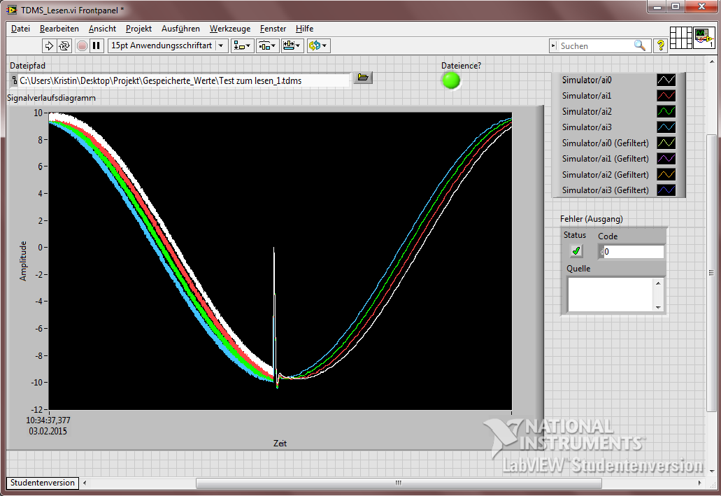 Vorgeschichte: Ich habe ein VI erstellt, das annaloge Spannungswerte mit Hilfe eines NI USB-6001 einliest. Diese Werte sollen optional mit einem Tiefpass gefiltert werden. Die Messwerte (sowohl gefilter und ungeiltert) sollen in EINER TDMS-Datei gespeichert werden. Zur besseren Unterscheidung habe ich daher zwei Gruppen angelegt: "Signal original" und "Signal gefiltert". Das ganze läuft soweit. Im nächsten Schritt, soll der Signalverlauf ausgelesen und wieder ausgegben werden.
