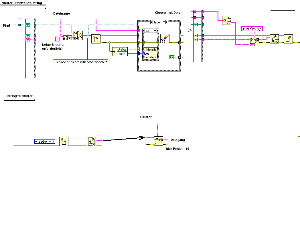 Jens hat das Problem der Zielenenden schon angesprochen mit dem Kopieren im Editor. Dasselbe tritt aber auch auf wenn Du Deinen Flattened Cluster mit der Write to Text File Funktion abspeicherst. Die heisst nicht nur per Zufall "Text", denn die macht default Zeilenende (EOL) Konversion. Alle <CR> <LF>, <CR> und <LF> alleine werden dabei mit der für die aktuelle Platform geltenden Zeilenendekombination geschrieben. Unter Windows ist das <CR> <LF>.Und Read from Text File macht das Umgekehrte, indem alle diese Zeilenenden in das LabVIEW Zeilenende <LF> umgesetzt wird. Darum sollte man für Binary Daten ja auch Write to Binary File UND Read from Binary File verwenden.
