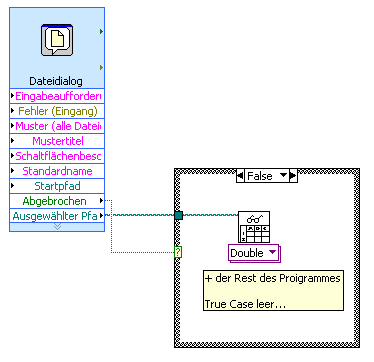 Das ist ganz normal, denn das 'Datei oeffnen'-VI kann dann in diesem Fall nicht ordnungsgemaess ausgefuehrt werden, weil eben der Dateipfad fehlt. Du musst ein Errorhandling fuer diesen Fehler machen..z.b. den Error out von Datei oeffnen in eine Case Struktur fuehren.