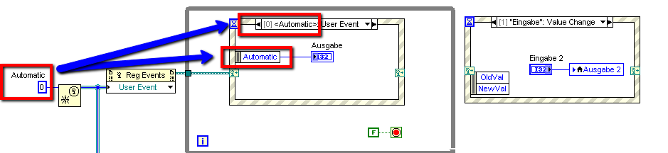 Kann man die User Events auch anders weitergeben, als über direkte Verbindungen? Am Eingang des "User Event Create" habe ich jetzt meine Eingabe angegeben. Dabei ist ja aber nur ein Dateityp verlangt oder? Dieser wird aber später gar nicht mehr verwendet. Wofür braucht man diesen Dateityp? So ganz bin ich da noch nicht durchgestiegen. Ich habe probiert aus dem "User event out" einen Indicator zu machen und diesen dann an das "User Greate Event" anzuschließen, doch leider gibt LabVIEW dann beim Ausführen dieses "User Greate Event" eine Fehlermeldung aus (An input parameter is invalid).