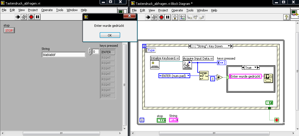 2. Das VI Acquire Input gibt ein Array mit den gedrückten Tasten zurück. Dieses wird nach der Entertaste durchsucht. Ein Event wird jedesmal ausgeführt, wenn etwas in das String Control geschrieben wird und das Array nach der Taste durchsucht. Die Konstante vor dem VI gibt aufschluss über die Möglichen Keyboardtasten (erstellen kann man sich die automatisch, indem man mit der Maus auf den Anschluss am VI zeigt und mit der rechten Maustaste das Menu aufruft und create Constant wählt), die man abfragen kann. In diesem Beispiel wird nicht die größere Enter-Taste abgefragt, sondern die neben dem Nummern Pad.