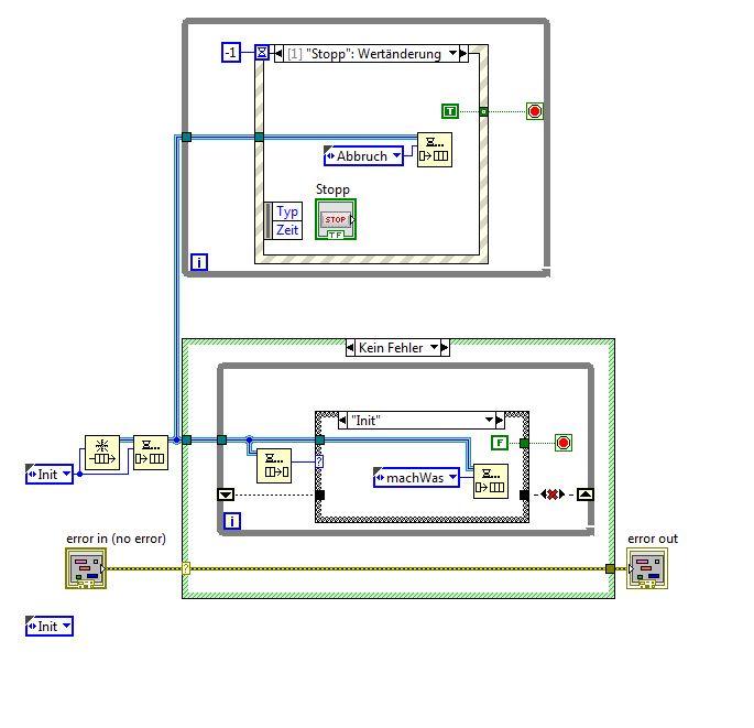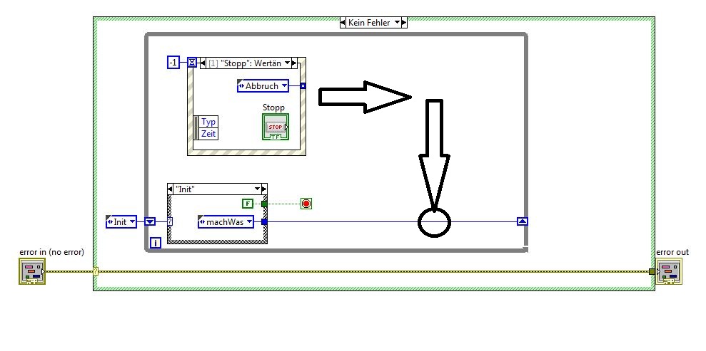 In einem Buch habe ich gerade noch eine andere Variante gesehen. Dort ist der Event-Case in einer separaten while-Schleife untergebracht. Dann wird mit einer Queue gearbeitet - mit der Queue könnte ich wahrscheinlich das Problem lösen, was ich in dem aktuellen Beispiel hab, wo ich die beiden Pfeile gezeichnet habe - nämlich wie ich nun die beiden Signalstränge miteinander koppele, damit auch das Ereignis-case dann in dem auswerte-Case abgearbeitet wird.