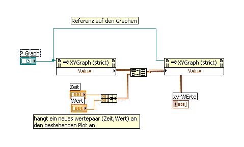 Aufgabe: für die Y-Achse liegen Signalwerte und für die X-Achse Distance-Werte vor, das läst sich mit XY-Graph darstellen. Wie fügt man aber neue Plots dazu, wenn der User die alte Messungen beibehalten möchte (als Referenz z.B.)