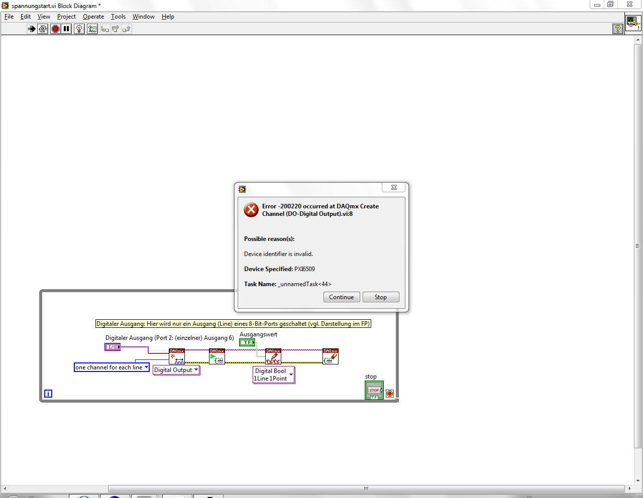 denke ich habe ein Vergleichsweise unterirdisches Problem! Also die Sache sieht so aus: Muss im Zuge meiner Hiwi-Stelle einen Versuchsstand anhand LV ansteuern. Hierfür werden 3 Digitale Ausgänge mit jeweils 5V (quasi TTL) benötigt. Kriege die 5V auch problemlos mit dem DAQ Assistant auf die Ausgänge... allerdings nicht mehr weg!