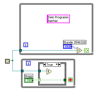 Abhilfe z.B: Statt "Wait" das Timeout von "Auf Occurrence warten" verwenden. Der Stop-Taster befindet sich in einer zweiten parallele Schleife und erzeugt beim Drücken die Occurrence, worauf das Programm sofort beendet wird. (im false-Case befindet sich ein Wait von 100ms)