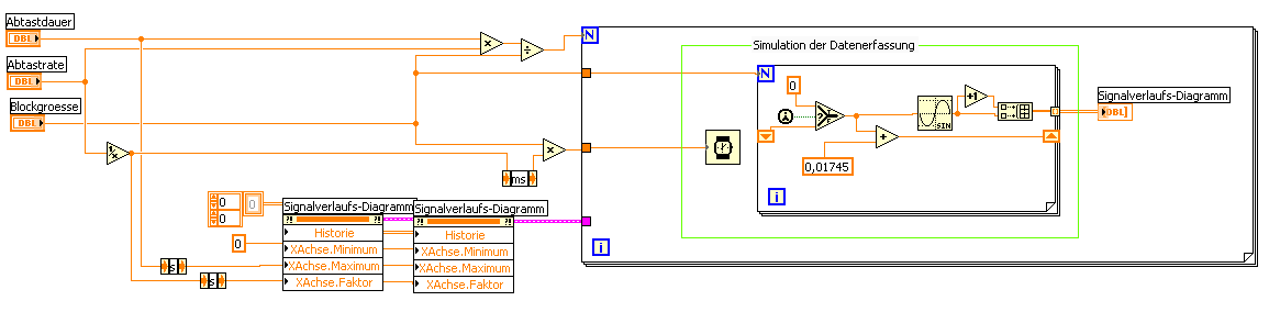 Wissenwert ist vielleicht noch, dass die Messwerte blockweise mit einstellbarer Blockgröße eingelesen werden. Wenn man mal von der Behandlung der speziellen Messkarte (DAP 840) absieht, ist es eigentlich ein ganz normales Diagramm: Vor der While-Schleife erfolgen die Initialisierungen der Karte, des Diagramms usw., dann folgt die While-Schleife, die blockweise Daten einliest und an das Diagramm übergibt, bis die gewünschte Anzahl Messwerte eingelesen wurde. dahinter werden dann die Messwerte gespeichert (zu diesem Zweck erzeuge ich dann passende Zeitwerte) und die Pipes der Messkarte wieder geschlossen. Dass die Reihenfolge der Abarbeitung ok ist, habe ich mit dem Debugger verifiziert.