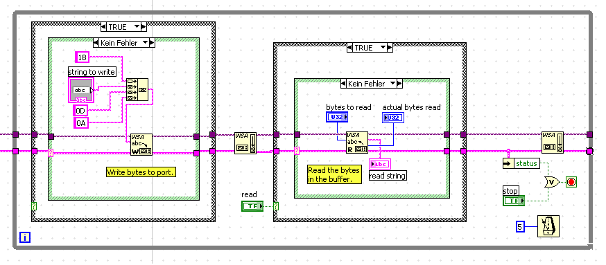 Klar, hier mal Screenshot-Auschnitt vom Blockdiagramm (ich hab die Initialisierung der Schnittstelle mal weggelassen, das sollte schließlich nicht neu für dich sein)!