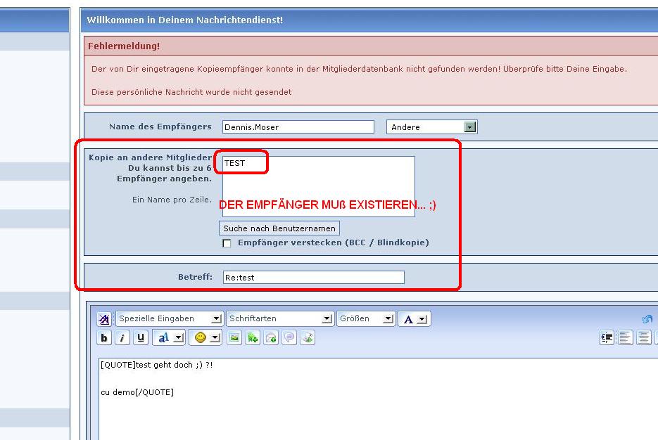 ich wollte gerade eine PN beantworten (per "Antworten") und bekam die Fehlermeldung, dass dieses Mitglied in der Datenbank gar nicht existiert. Der Name des Empfängers wurde aber automatisch richtig übernommen. Nachdem ich dies Dennis per PN mitteilen wollte hat dies auch nicht geklappt.