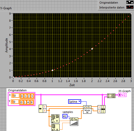 Du muß also die Interpolation selbst in die Hand nehmen. Die Sache wird erleichtert durch fertig bereitgestellte Interpolations-Vis in Mathematik -> Interpolation und Extrapolation. Hat auch den Vorteil, daß man besser interpolieren kann als nur linear.