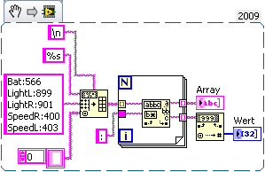 Das sind ADC-Werte eines Mikrocontrollers. Um sie zu plotten, durchsuche ich den Stream nach ":" und habe dahinter eine Case-Struktur, die dann je nach Vorterm "Bat", "LightL", "LightR", ... den hinter dem ":" liegenden Wert erst in eine Zahl umwandelt (VI: String nach Zahl).