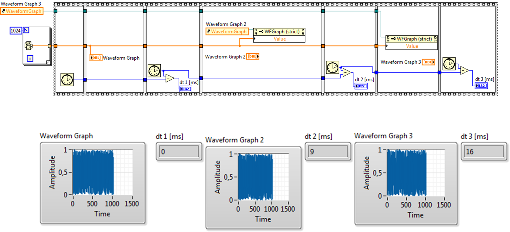 In meinem Projekt nehme ich mit 51.200 kSamples/s abgetastete Signale auf und muss sie in bestimmten Blocklängen in den Graphen schreiben. Bei einer Blocklänge von 1024 Samples, muss sich der Graph alle 0,02 s (20 ms) aktualisieren. Wenn ich aber allein für das schreiben eines Blocks 80 ms benötige und das ganze in z.B 10 Graphen schreiben will (parallele Verarbeitung projektbedingt nich möglich), dann liege ich zeitlich bei 800 ms pro Block und verpasse somit 800ms / 20ms = 40 Blöcke á 1024 Werte.
