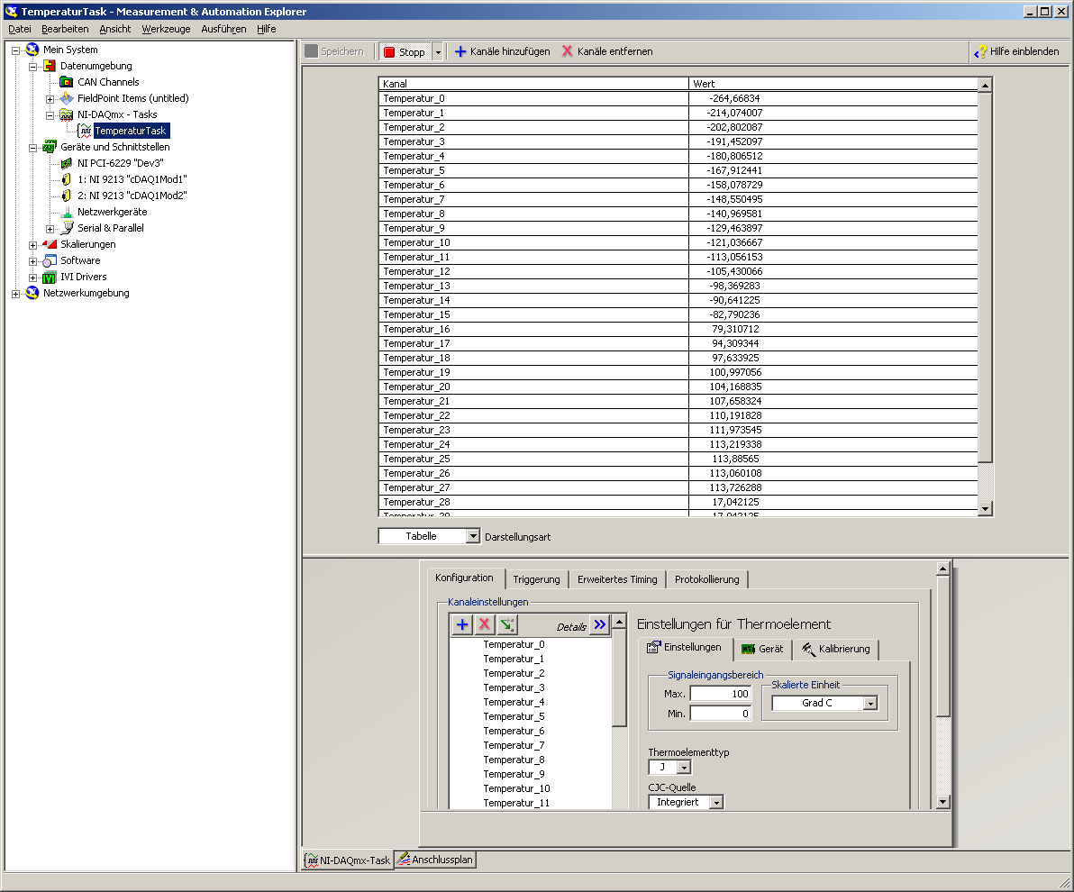 Die einzelnen Module auszulesen und anzusteuern funktioniert einwandfrei. Entweder einzeln oder alle Kanäle der AI-Module in einem Task zusammengefasst. Letzteres bietet mir schon eine exakte zeitliche Synchronisierung aller Kanäle verschiedener AI-Module in einem einzelnen Chassis.