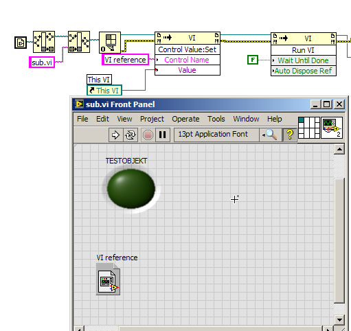 Da du LabVIEW 2012 verwendest könntest du auch einen asynchronen VI-Aufruf verwenden statt "Run VI", dann kannst du die Eingänge direkt verdrahten statt "Control Value:Set" verwenden zu müssen.