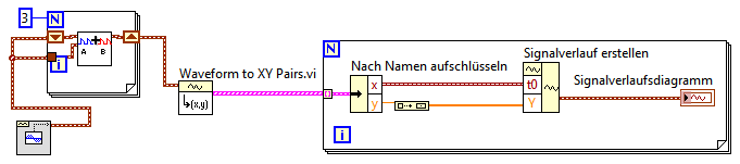 Leite ich aber das vorher erzeugte Signal direkt in ein Signalverlaufsdiagramm (wohlgemerkt, ich hab die digitalen Werte schon "vervielfacht"), werden mir dennoch nur Punkte angezeigt. Ich hab mir schon überlegt, dass Append Waveform vielleicht die t0-Werte der Signale vergleicht und darum eine eigene Funktion geschrieben, die einfach nur die Arrays aneinanderhängt und dabei den t0-Wert des ersten Signals behält, aber das hilft leider auch nicht. Was könnte ich sonst machen?