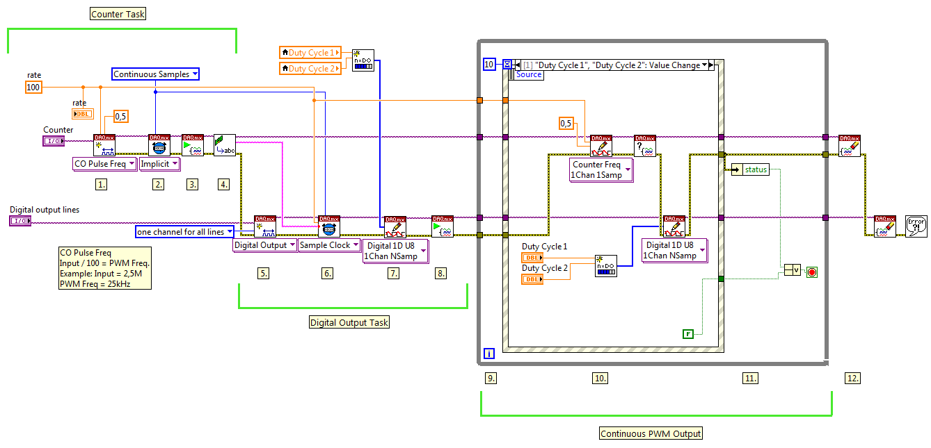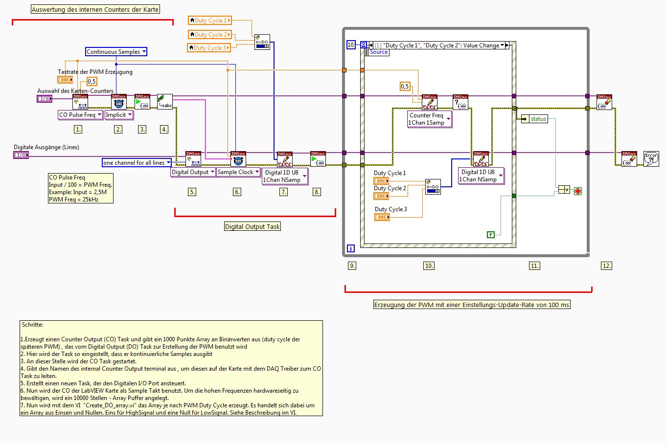 Ich möchte einen VI programmieren, das es mir ermöglicht, eine PWM aus 5V TTL Impulsen zu erzeugen. Die Impulsbreite ist pro Programmausführung konstant und die Impulsbreite soll über einen Drehregler in LabVIEW einstellbar sein. Wichtiges Kriterium ist die hohe Frequenz der PWM: Sie soll bis 20 kHz gehen, ein Duty Cycle soll also nur 50 us dauern und das kleinste erzeugbare Rechteck soll 1 us einen High-Pegel annehmen.