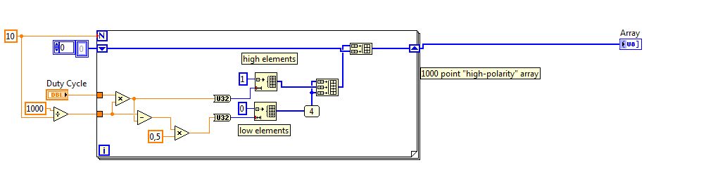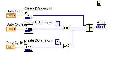 Hier jetzt auch noch das Sub VI, das über Compound Arrithmetic eine multiples Duty Cycle Array bekommt... mit 2 Duty Cycle Arrays funktioniert das wunderbar, ich habe jetzt einfach das 3te Array hinzugefügt und dann eben den Shift auf 2 gesetzt. WObei mir noch nicht 100% ig klar ist, warum man das so löst und vor allem warum ein Ausgangsarray entsteht, das 1000 Werte hat, obwohl die 3 einzlenen Duty Cycle Arrays je 1000 bits besitzen.[