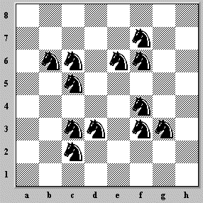 Mit 12 Springern, z.B. auf den Feldern c2, c3, d3, f3, g3, f4, c5, b6, c6, e6, f6, f7, können alle freien Felder bedroht werden:
