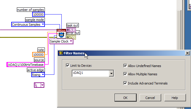 Manuell wurde eine Terminal-Refnum erstellt. Dann per Rechtsklick->I/O Name Filtering der dargestellte Dialog aufgerufen. Die 100 kHz Clock wird dir erst angezeigt, wenn du "Advanced Terminals" aktivierst.