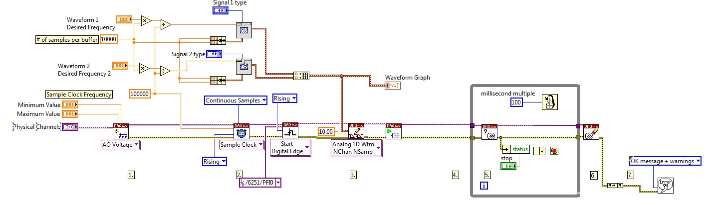 Vielen Dank, das hat mir geholfen jetzt funktioniert es schonmal die 2 Ausgänge seperat anzusteuern. Ich hab das gleich mal in mein VI mit reingeladen und ich stelle es mal zur Verfügung, falls jemand ein ähnliches Problem hat. Momentan bin ich noch am ausprobieren wie ich es hinbekomme z.B. Parallel ein Rechtecksignal mit 100kHz und ein Sägezahn-Signal mit 1/60 bis 1Hz zu erzeugen. Das Sägezahnsignal wollte ich so ausshen lassen wie ein "Treppensignal" also einfach die Samples runterdrehen, allerdings müssen die Samples von beiden Kanälen identisch sein. Gibt es noch eine andre Möglichkeit ein "Treppensignal mit dieser Frequenz zu erzeugen ?