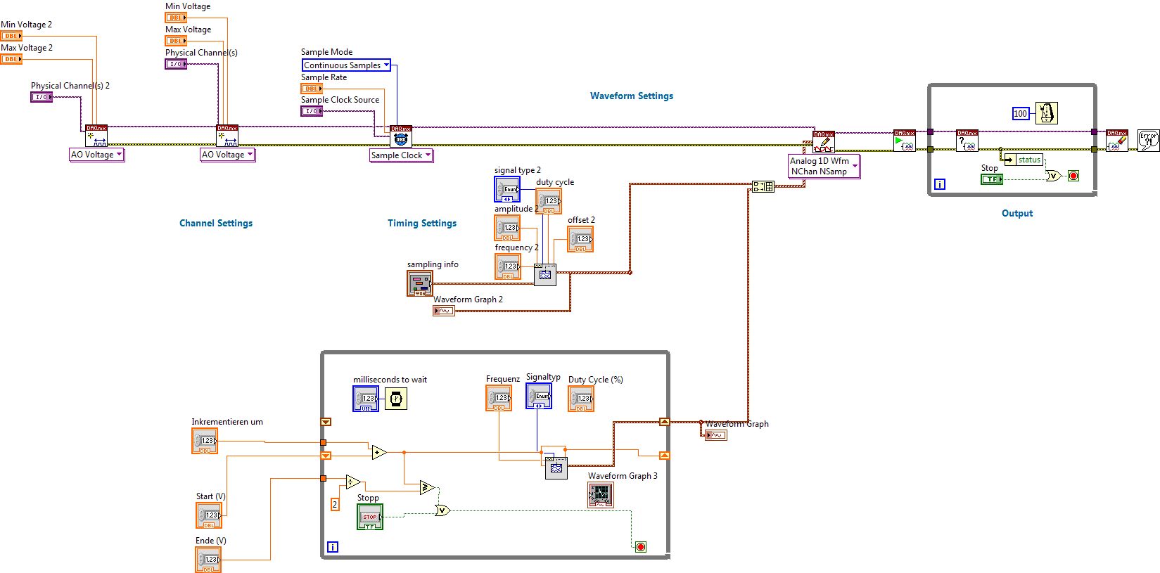 Ich habe dann mal das Beispiel von LabView für einen Ausgang (Voltage - Continuous Output.vi) angesehen und es mal angefangen zu erweitern.