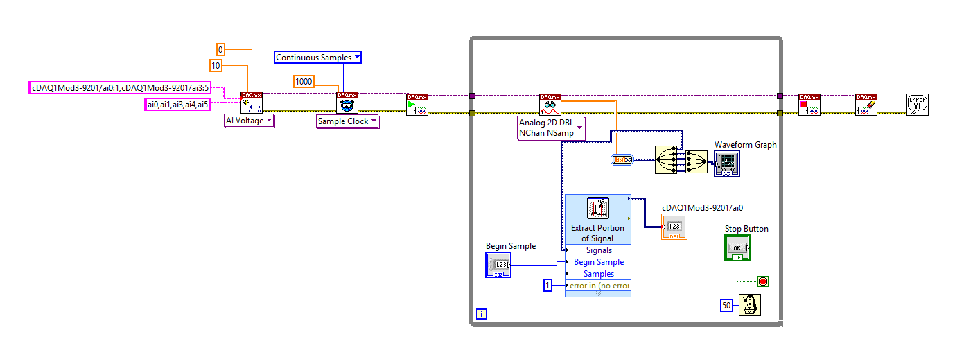 ich möchte mit LabVIEW 2012SP1 5 Analoge Signale (0-10V) aufnehmen (Kanäle: ai0,ai1,ai3,ai4,ai5). Dabei sollen die Signale ai1,ai3,ai4,ai5 einfach in eine TDMS-Datei geschrieben werden mit einer vorgegebenen Aufnahmerate (continuous samples).