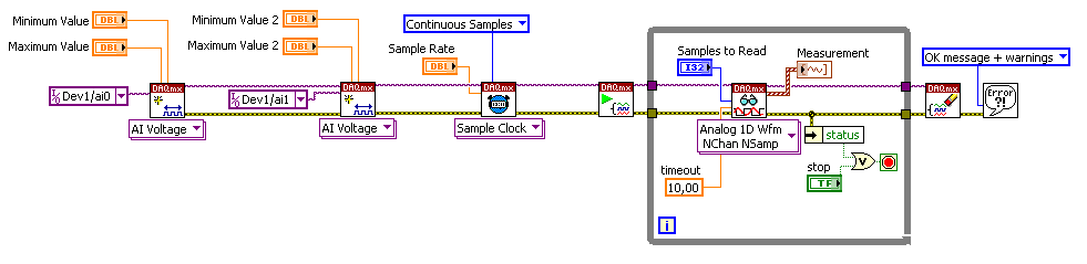 Ich habe ein VI erstellt, welches mehrere Analogsignale mit einer angegebenen Abtastrate in einer Grafik anzeigt und gleichzeitig in eine Datei schreibt. Ich habe das mit ein DAQ-Assistenten und weiteren 'vorgefertigten' Komponenten erstellt. Klappt soweit super.