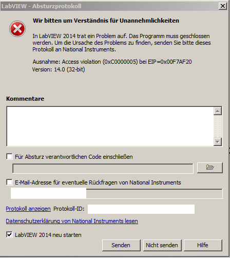 Jetzt ist es allerdings so, dass das VI abstürzt wenn Größenänderungen stattfinden(nicht immer aber oft). Das tolle an der Geschichte ist, dass der Absturz vermeintlich vor dem Einsprung in das VI ResizePlot.vi stattfindet. Das ganze geht sogar soweit, dass LabVIEW in der IDE (nicht zur Laufzeit des VIs) abstürzt wenn ich die Fenstergröße ändere.