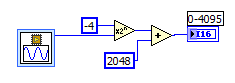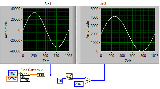 Mein Vorschlag war eine Division y=x/16, der Vorschlag von Jens ist aber ebenfalls keine Shift-Operation, sondern die qasi identische Division y=x/2^4. (Die Labview Funktion y=2^n macht vielleicht intern eine Shift-Operation, das ist aber belanglos. Wichtig ist nur, das der vorzeichenbehaftete x-wert nicht geshiftet, sondern dividiert wird)