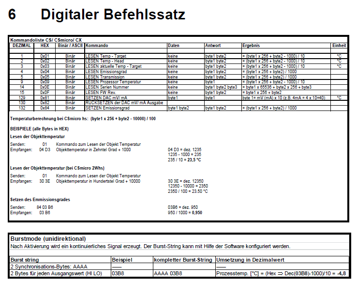 Das Thermometer kommuniziert über verschiedene Befehle, die ich als Bild angehängt habe. Ich möchte erstmal nur die Temperatur abfragen und erwarte 2 Byte als Antwort, die auch immer kommen.