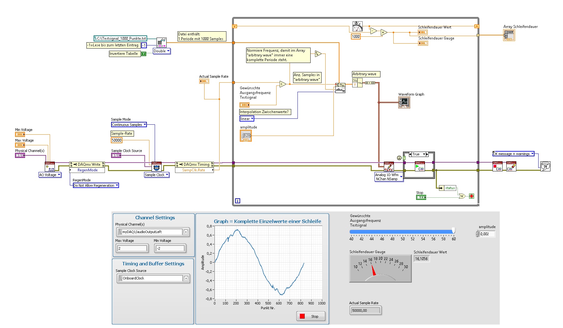 Beispiel: Bei gewünschter Ausgangsfrequenz von 60 Hz des Testsignals und 50000 kS/s quetscht das "Arbitrary wave.vi" ja das Testsignal auf 833 samples und schickt sie an DAQmx(Write). Da ja mit "Do not allow regeneration" gearbeitet wird, werden nach meinem Verständnis diese 833 samples abgearbeitet und im nächsten Schleifendurchgang die nächsten 833 abgeholt (Sofern man nicht eine andere gewünschte Ausgangsfrequenz einstellt).