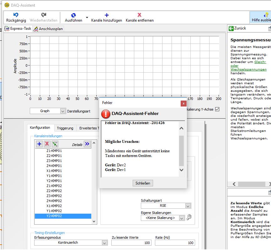 Im DAQ-Assistenten werden mir beide AD-Wandler angezeigt (USB-6000). Dort wähle ich dann jeweils von beiden AD-Wandlern die Kanäle 0-7. Wenn ich das so einstelle wird mir der Fehler angezeigt: Geräte unterstützen keine mehreren Tasks.