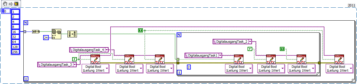Zitat:Dann erstelle dir einen einzigen DAQmx-Task für alle 4 Bits und eine passende (digitale) Waveform zur Ansteuerung! Dann reduziert sich dein Software-Aufwand auf das Erstellen der Waveform und ein einziges DAQmxWrite…