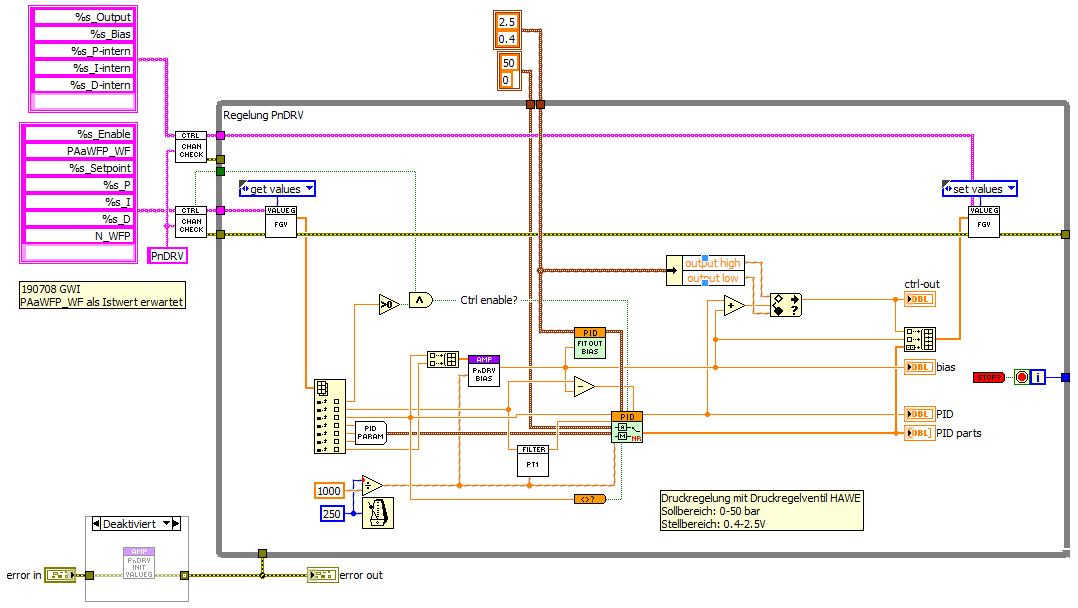 (Das Druckregelventil arbeitet an sich ganz nett, ist aber leider sensibel für Störgrößen wie Medium-Massenstrom. Deshalb reicht keine einfache Steuerung, sondern eben der PID mit Vorsteuerung.)