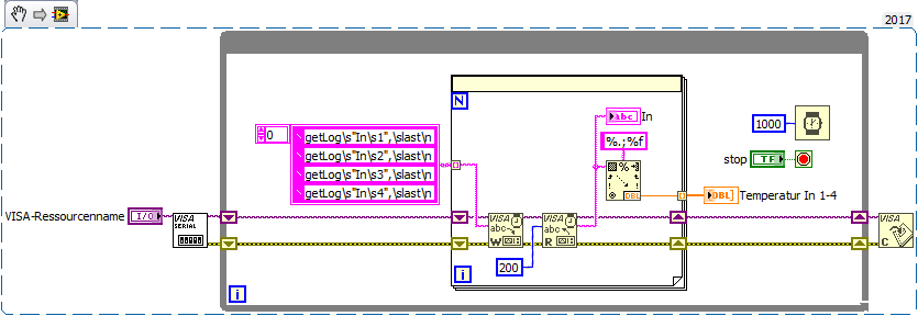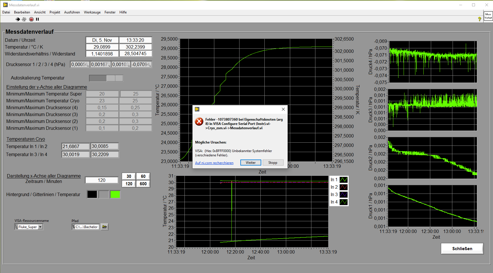 Ich spreche über ein Sub-VI ein Tieftemperaturregler CTC100 an (USB-Schnittstelle), um mir die Messwerte ausgeben zu lassen. Diese werden mit anderen Messwerten dann im Hauptprogramm gespeichert. Nun habe ich das Problem, dass das Programm ca 2-3std einwandfrei läuft. Danach bekomme ich am Gerät selbst, als auch in LabVIEW Fehlermeldungen.