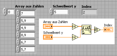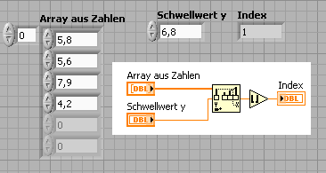 Nimme das "Schwellwert (1D Array)" VI von der Array Palette. Den gebrochenen Index den du bekommst rundest du auf die nächste kleinere (Ganz-)Zahl ab und dann hast du den Index den du willst.