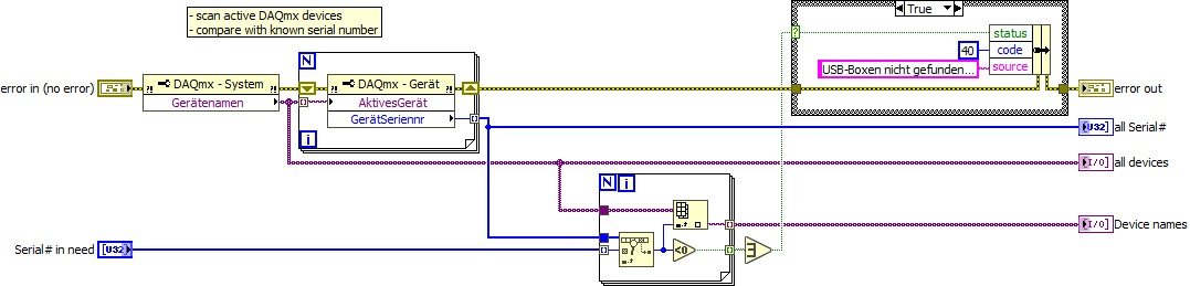 ich finde kein entsprechendes VI um mir die Dev Namen auslesen zu können. Bin grade nochmal die DAQmx palette durchgegangen. Nehme mal an darüber krieg ich dann ne Dev Referenz die ich über Property Node untersuchen kann? Sowas in der Richtung hatte mir ja eigentlich vorgeschwebt. Ich find beim durchgehen nur diese "Ringkonstante" Dev.