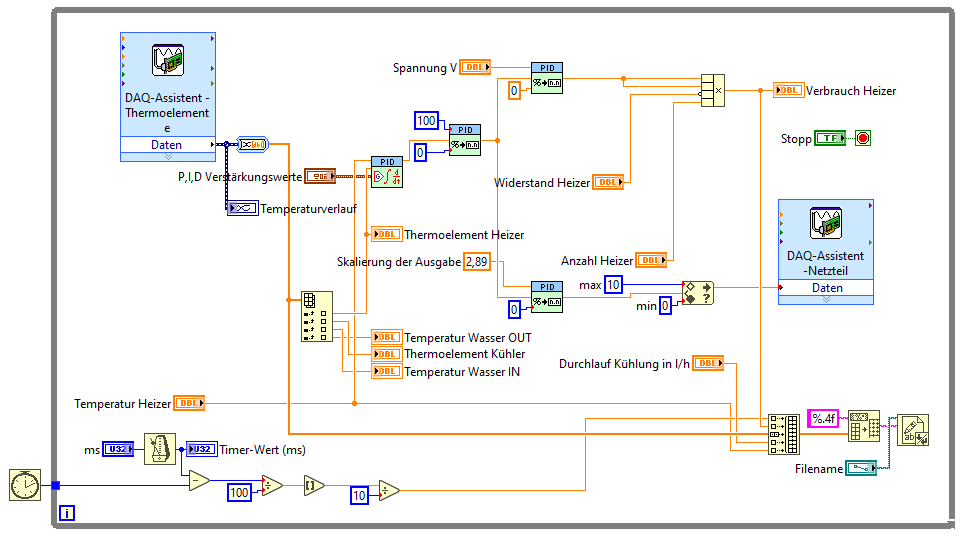 Folgendes benötige ich für meine Thesis: Ich möchte über Labview Temperaturen messen, sowie über einen PID-Regler ein Labornetzteil ansteuern, welches wiederum einen Heizer versorgt. Die Temperaturen und den Verbrauch der Heizer, sowie den Zeitpunkt der Erfassung als Zeitstempel von 00:00:00 aufsteigend usw. möchte ich in ein Excel-Dokument speichern.